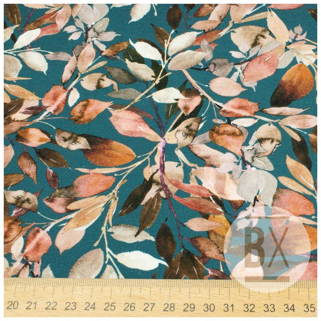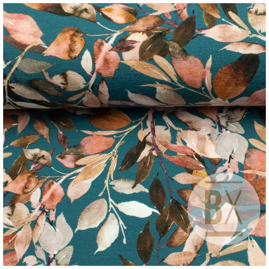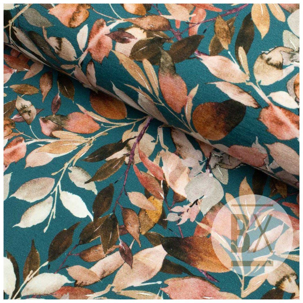 Digital jerseyanyag - Őszi levelek pétróleumkék