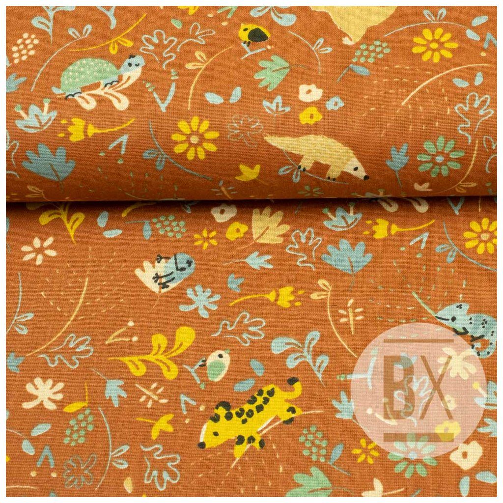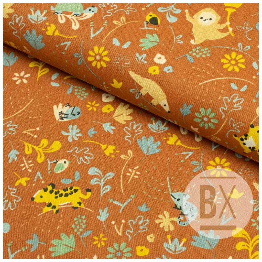 Mintás pamut - Vidám dzsungel - Rozsdabarna
