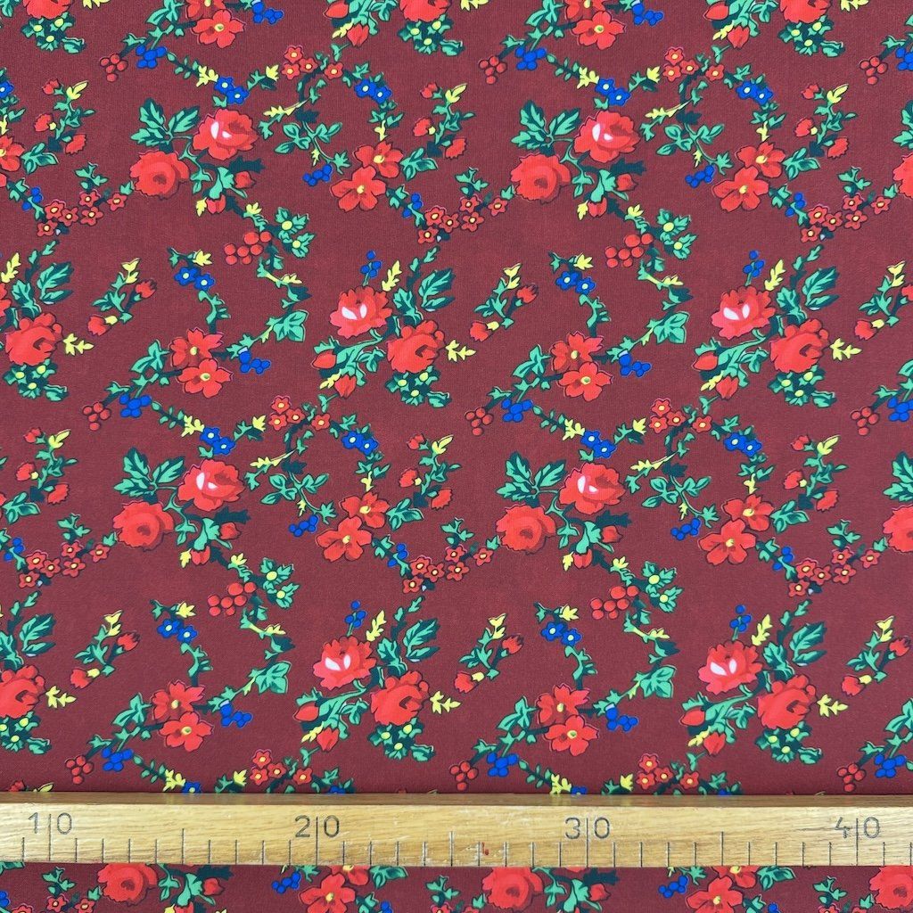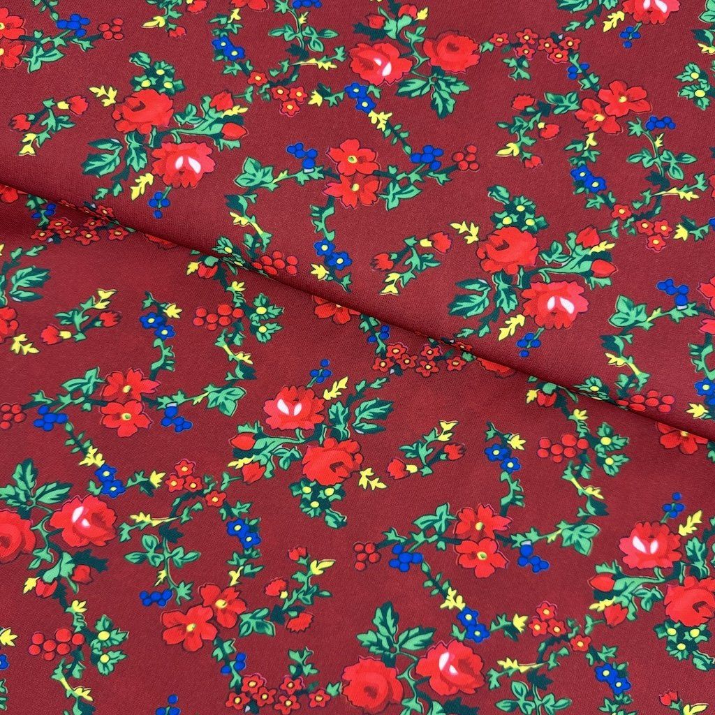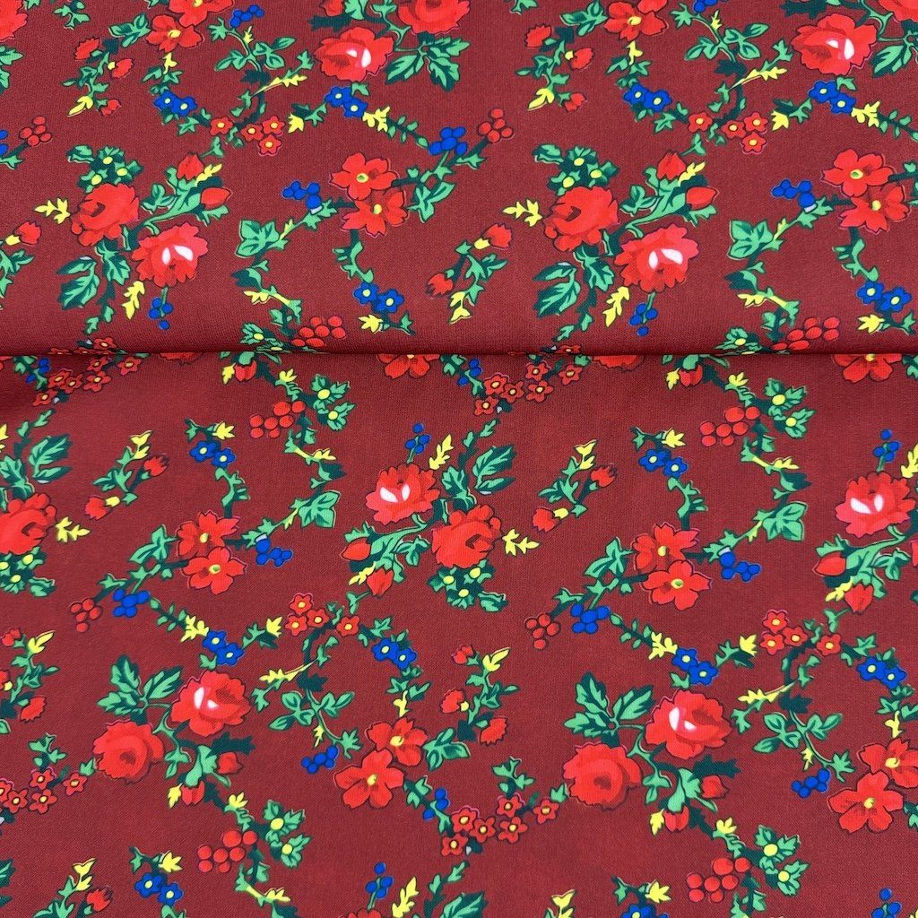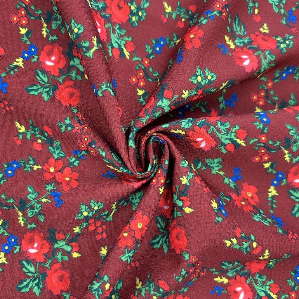 TIBET népi mintás folklóranyag könnyen eső, kellemes tapintású, különböző színváltozatokban kapható. Színes kis virágokkal nyomtatott anyag, amelynek súlya 250 g/m2 és összetétele 100% poliészter, ideális népi ruhák és kiegészítők varrásához.