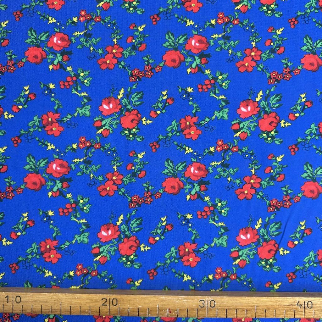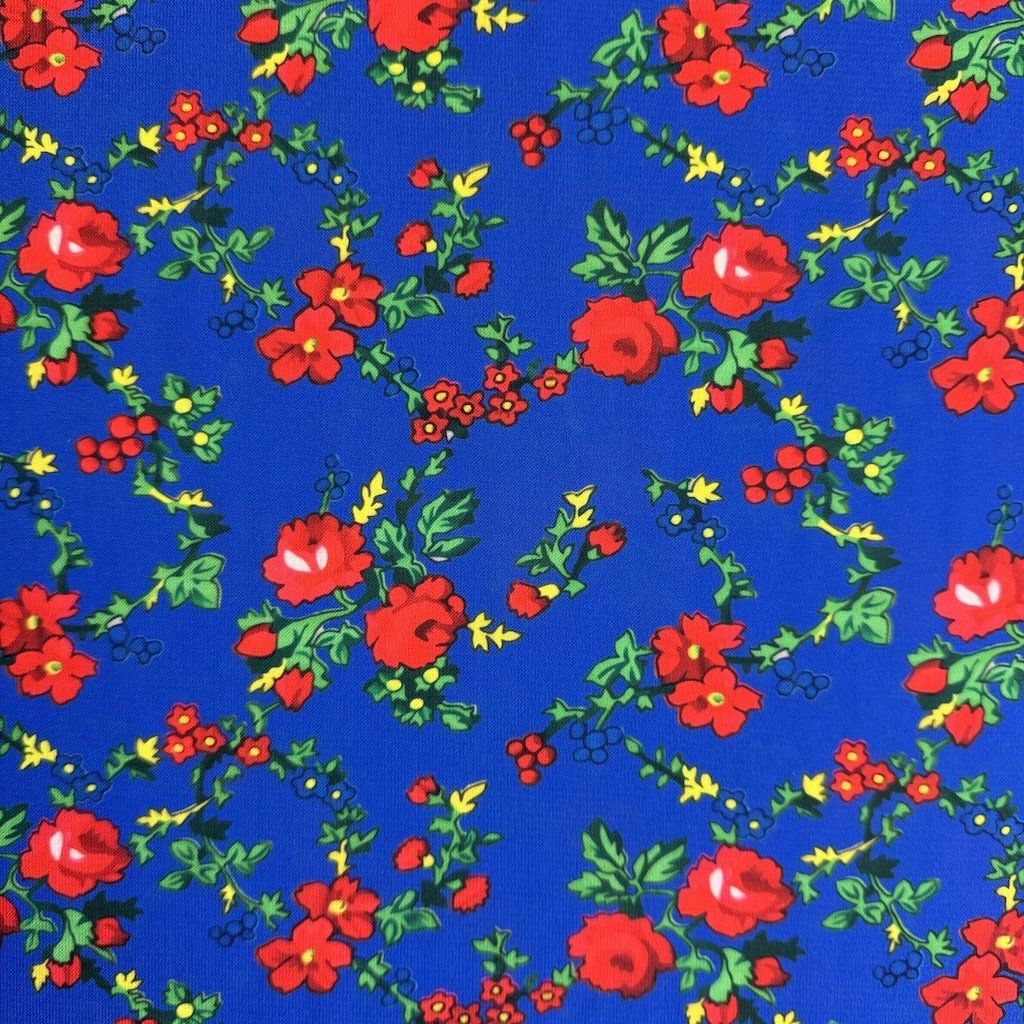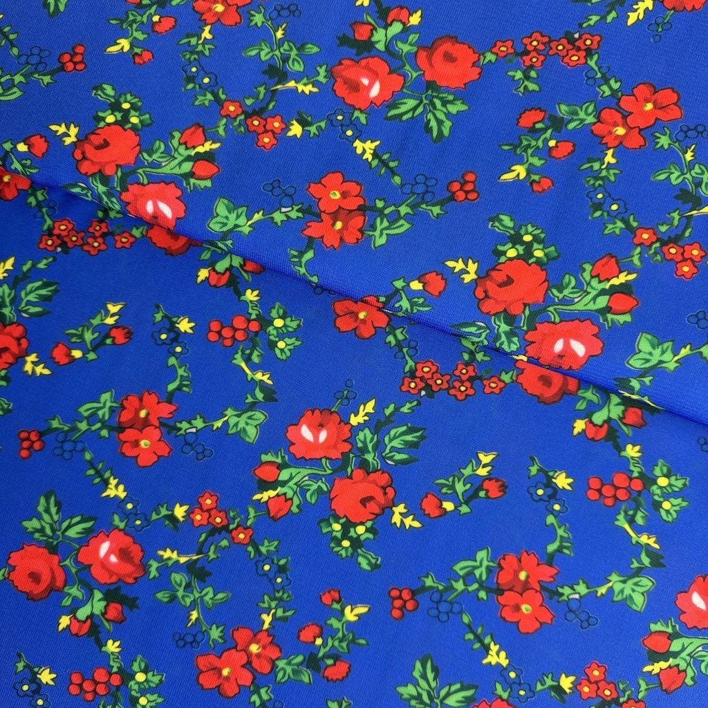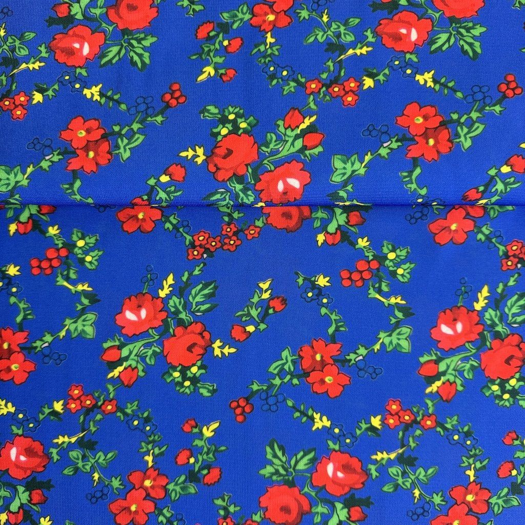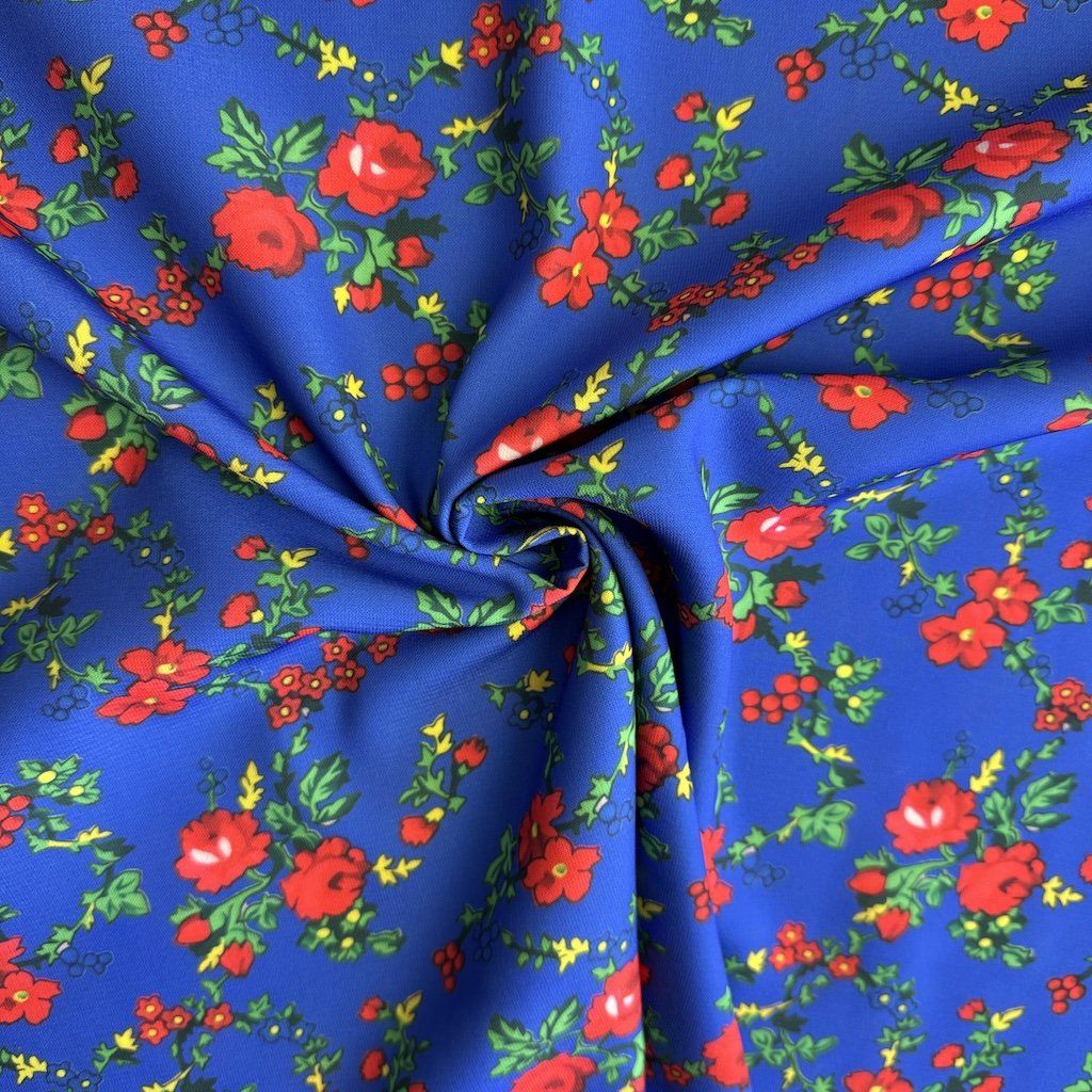 TIBET népi mintás folklóranyag könnyen eső, kellemes tapintású, különböző színváltozatokban kapható. Színes kis virágokkal nyomtatott anyag, amelynek súlya 250 g/m2 és összetétele 100% poliészter, ideális népi ruhák és kiegészítők varrásához.