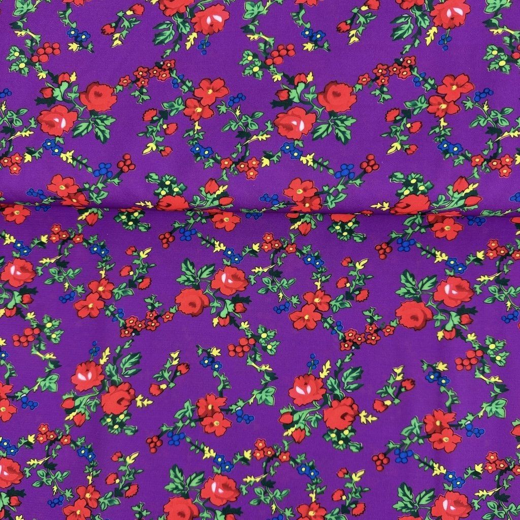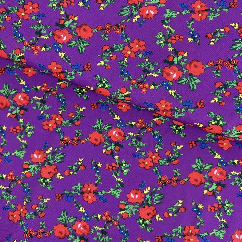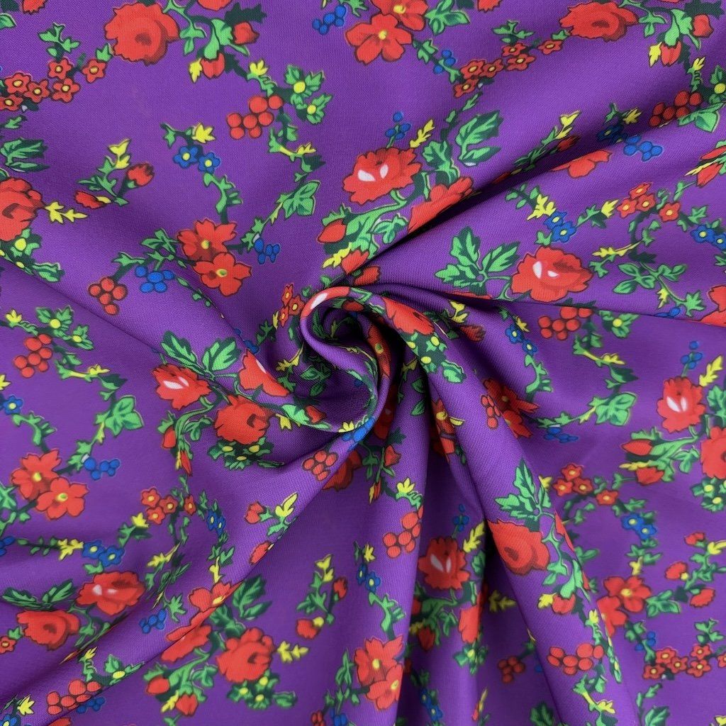 TIBET népi mintás folklóranyag könnyen eső, kellemes tapintású, különböző színváltozatokban kapható. Színes kis virágokkal nyomtatott anyag, amelynek súlya 250 g/m2 és összetétele 100% poliészter, ideális népi ruhák és kiegészítők varrásához.
