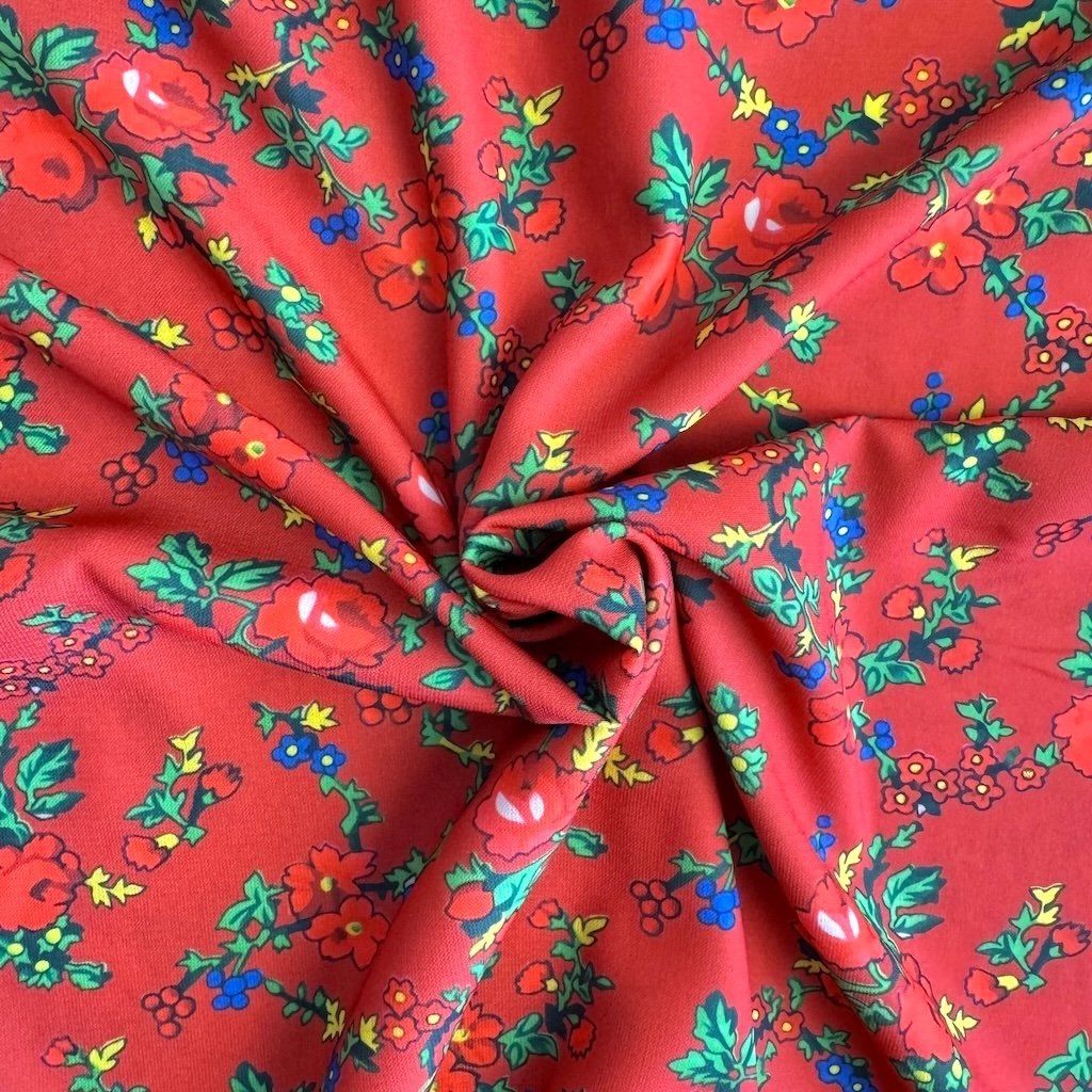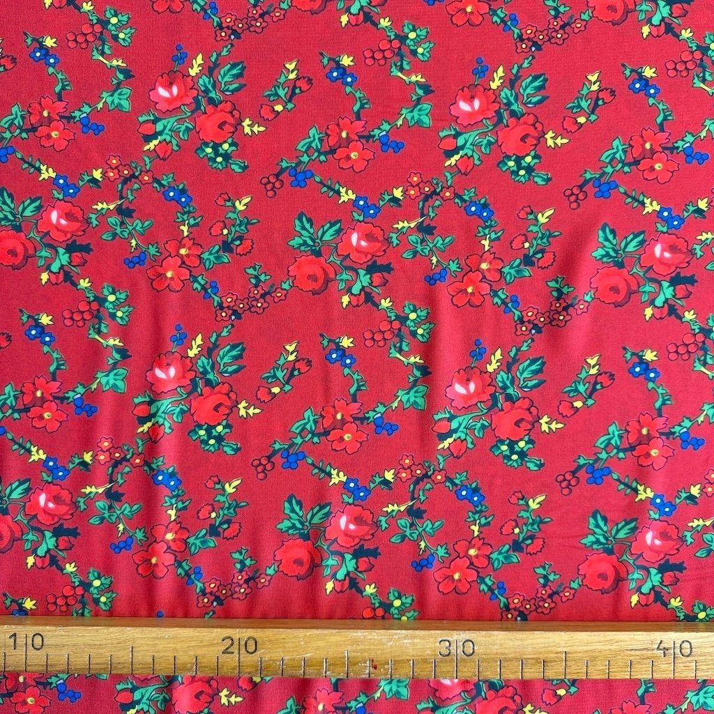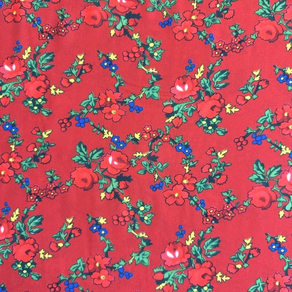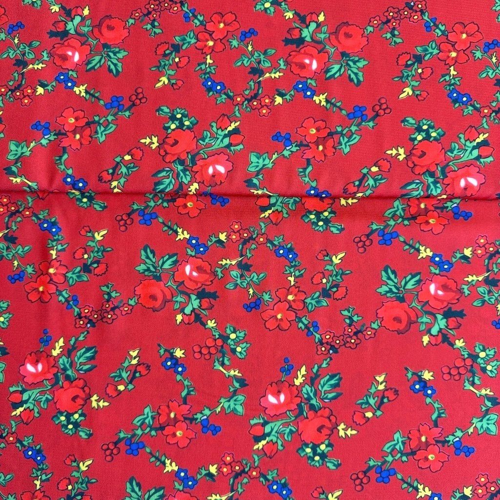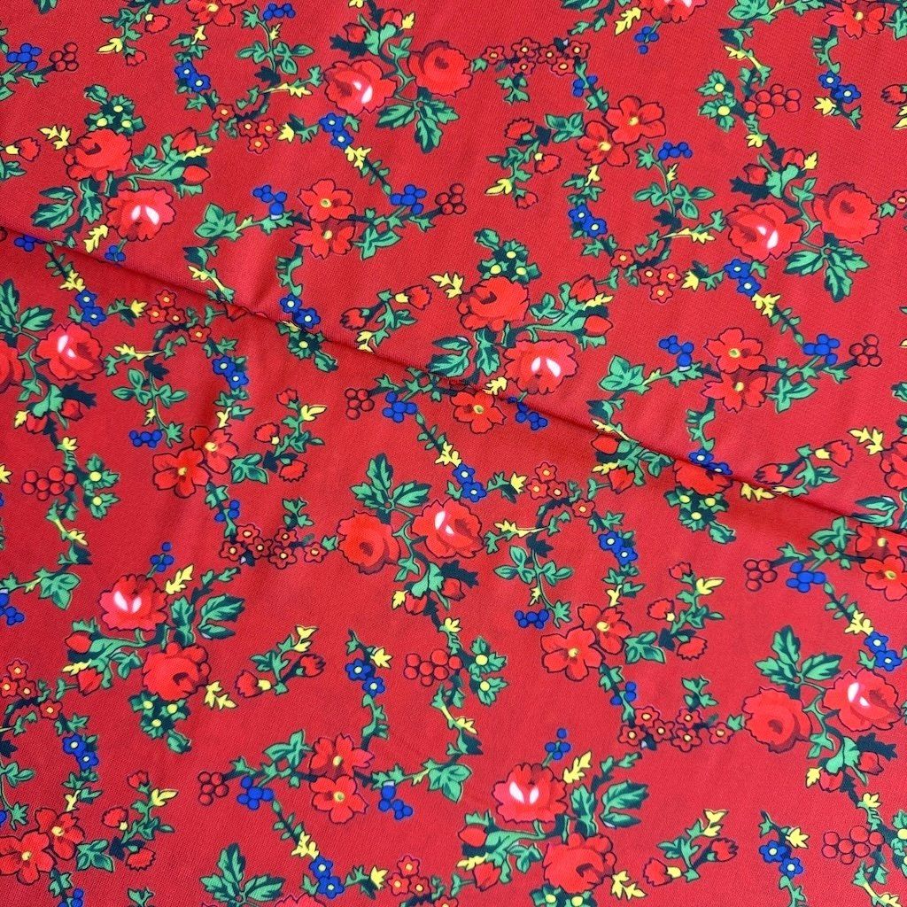 TIBET népi mintás folklóranyag könnyen eső, kellemes tapintású, különböző színváltozatokban kapható. Színes kis virágokkal nyomtatott anyag, amelynek súlya 250 g/m2 és összetétele 100% poliészter, ideális népi ruhák és kiegészítők varrásához.