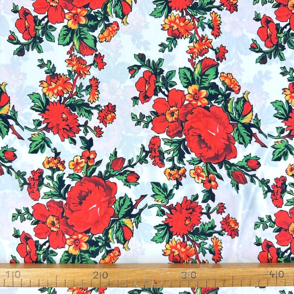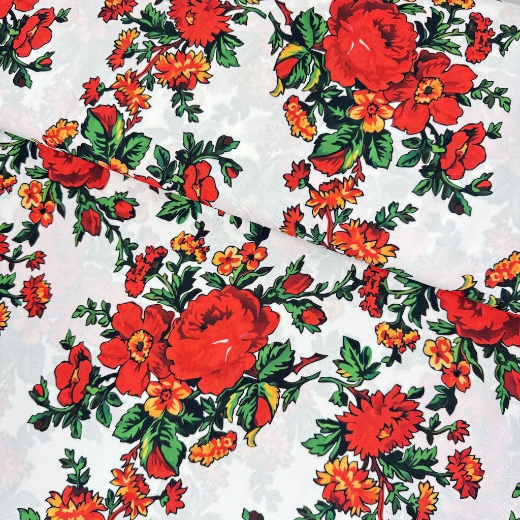 A TIBET népi mintás folklóranyag könnyű, leomló, kellemes tapintású anyag, különböző színváltozatokban kapható. Színes kis virágokkal nyomtatott anyag, amelynek súlya 250 g/m2 és összetétele 100% poliészter, ideális népi ruhák és kiegészítők varrásához.