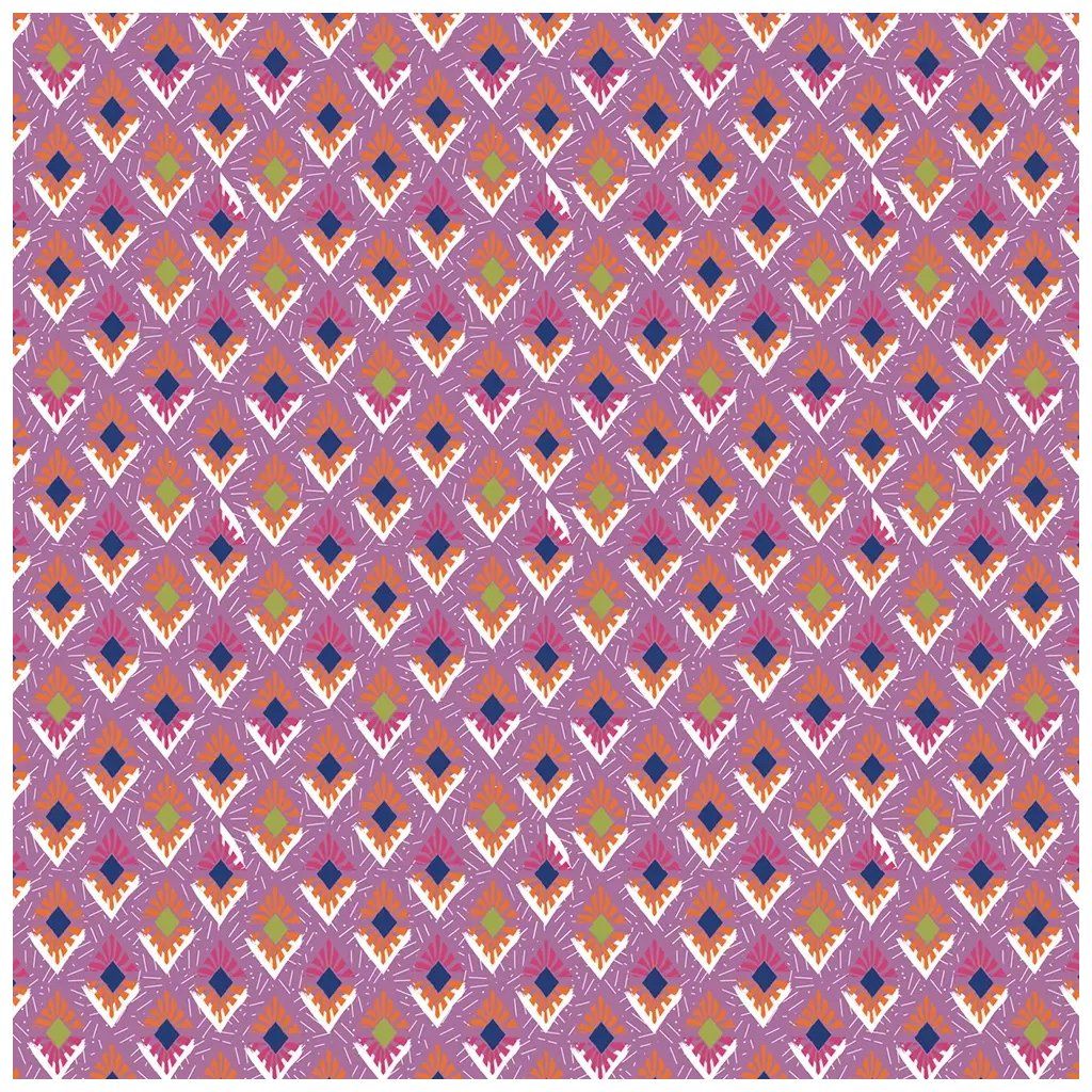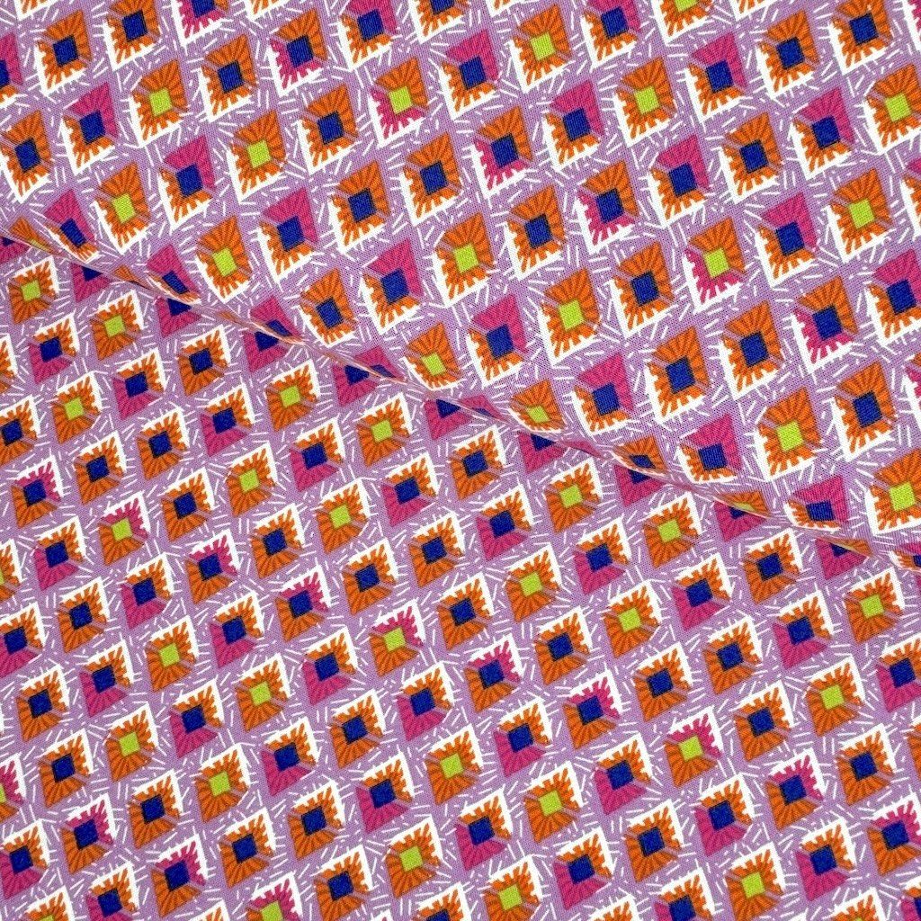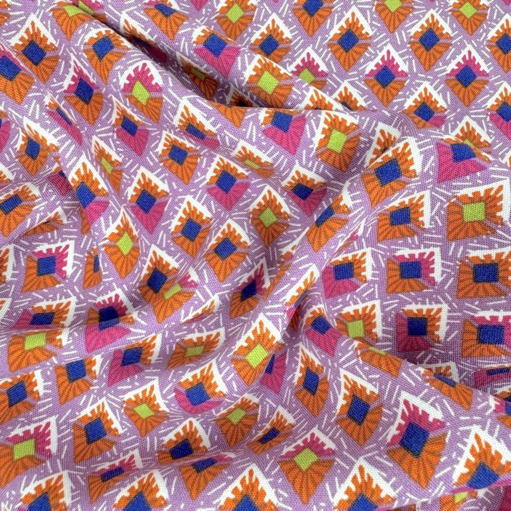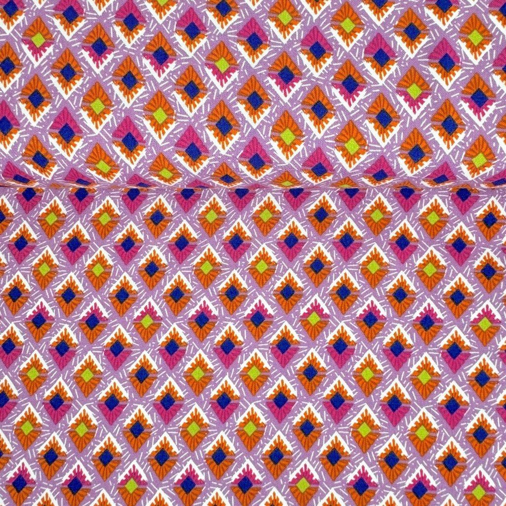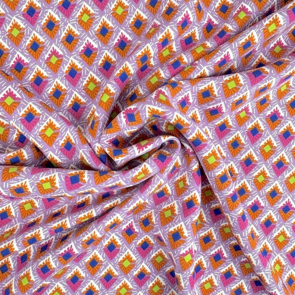 A finom és ragyogó, 100% viszkóz anyag szőtt rombuszmintás, élénk narancs, rózsaszín és zöld árnyalatokkal, világos lila alapon.